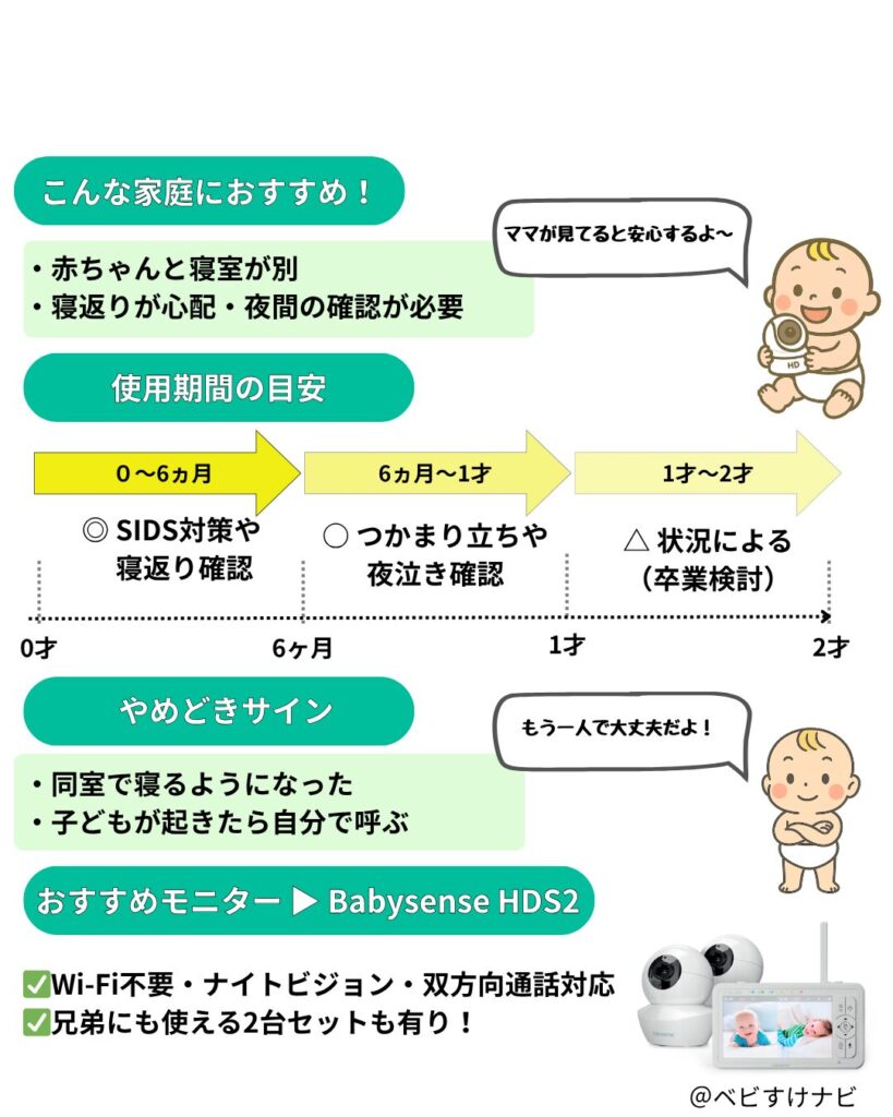 | Babysense HDS2 | 約18,000〜22,000円 | Wi-Fi不要 | ◎ 親機あり | ◎ 対応 | ◎ 対応 | 2台カメラセットあり・電波安定 |