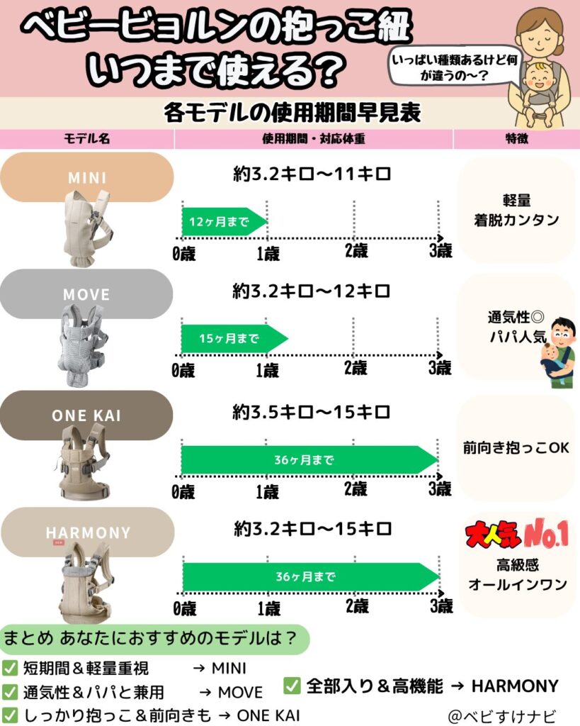 「ビョルンっていっぱい種類あるけど、何が違うの〜?」って迷う人多いよ!ここでスッキリ整理しちゃお♪