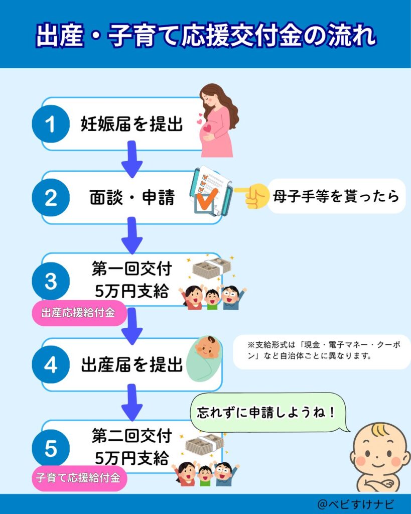 📌 ポイント ・国の財源で自治体が支給を担当 ・妊娠届出時と出生届出時にそれぞれ給付 ・現金またはクーポン形式で支給