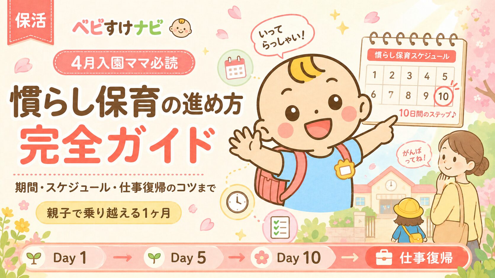 4月入園を控えて、慣らし保育の不安を抱えるママ・パパは少なくありません。この記事では、慣らし保育の標準スケジュール(10日間モデル)、仕事復帰との両立、子どもが泣く時の対応、そして親のメンタルケアまで完全ガイドします。